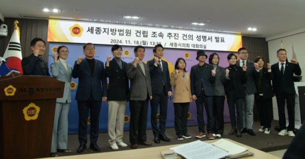 [충청뉴스 최형순 기자] 세종시의회 의원 일동은 18일 의회 대회의실에서 성명서를 통해 의회는 세종시민의 기대에 부응하여 하루속히 세종지방법원 관련 예산 확보 및 실제 공사가 착공될 수 있도록 국회 차원이 각별한 관심과 지원을 건의했다.