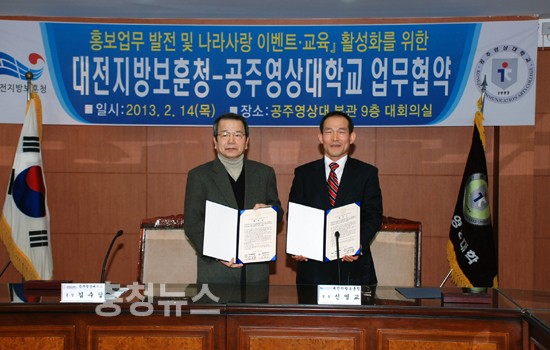 대전지방보훈청(청장 신영교)은 보훈공무원의 대국민 홍보마인드 제고와 학생들의 나라사랑 교육 등에 있어 공주영상대학교(총장 김수량)와 상호협력을 통한 원할한 수행을 위해 14일 MOU를 체결했다고 밝혔다.