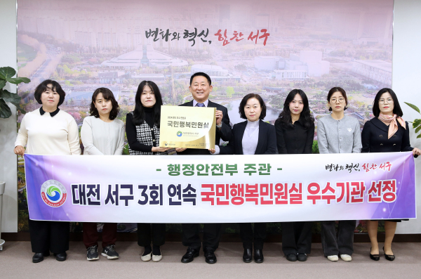 [충청뉴스 박영환 기자] 대전 서구는 행정안전부가 주관하는 ‘2024년 국민행복민원실’공모에서 우수기관으로 선정돼 3회 연속 우수기관으로 인증을 받았다.