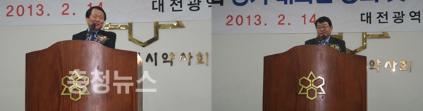 14일 오후 서구 월평동 대전 약사회 제 25차 정기총회 자리에서 염 시장은 '경쟁사회 사람가치 훼손' VS 박 의원은 '선거 없이 당선 되는 약이 필요하다'며 미묘한 설전을 펼쳐 주목을 받았다.