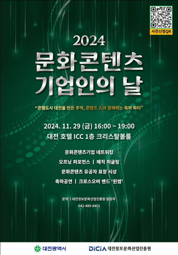 [충청뉴스 김용우 기자] 대전정보문화산업진흥원(이하 진흥원)은 오는 29일 호텔 ICC에서 대전시 문화콘텐츠 산업의 최대 통합 네트워킹 행사인 ‘2024년 문화콘텐츠 기업인의 날’을 개최한다고 27일 밝혔다.