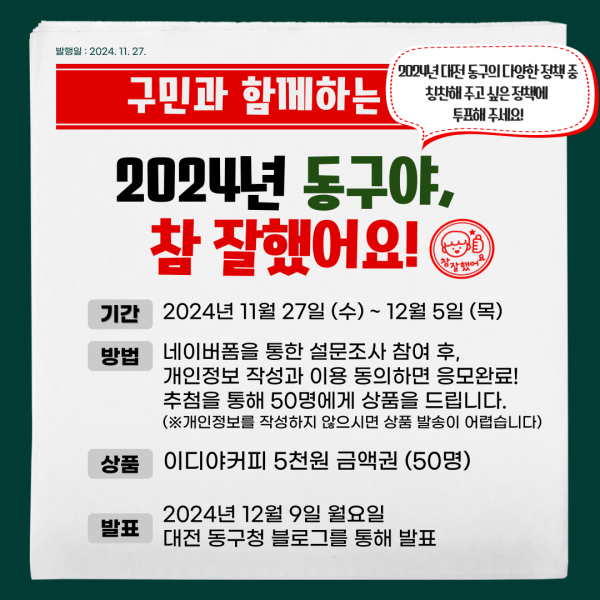 ‘2024년 동구야, 참 잘했어요!’ 온라인 투표는 대전 동구청 공식 네이버 블로그에서 참여할 수 있으며, 동구 주민뿐만 아니라 누구나 참여할 수 있다.