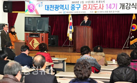 대전시 중구(구청장 박용갑)는 점차 사라져 가는 우리 전통의 효 실천과 孝 문화 진흥을 이끌어 나갈 ‘어르신 孝 지도사 양성교육’ 개강식을 19일 대한노인회 중구지회에서 가졌다.