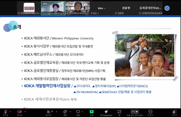 [충청뉴스 이성현 기자] 대전대학교는 인문사회 융합인재양성 사업단이 최근 관련 분야 전문가와 재학생 약 30여 명이 참여한 가운데 ‘연결된 세계-세계 시민으로의 성장’ 온라인 특강을 ZOOM을 통해 진행했다고 2일 밝혔다.