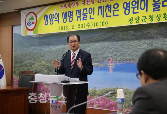 이석화 청양군수가 지난 20일 오전 10시에 군청 상황실에서 언론과의 브리핑을 통해 국토해양부에서 발표한 ‘지천댐 건설 계획’에 대한 군의 입장을 발표했다.