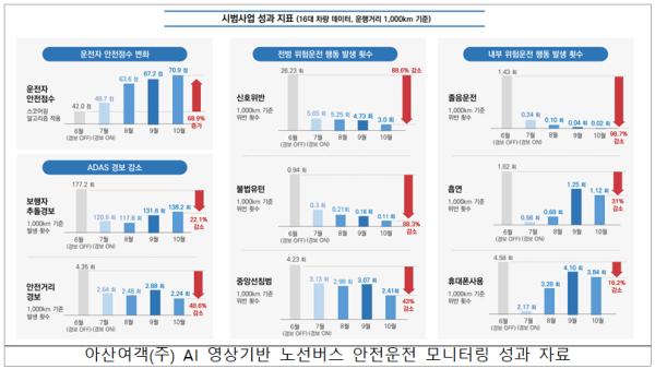 그 결과, 아산여객(주)의 사업추진 기간 동안(7.1~11.30)의 졸음운전 98.7% 감소, 신호위반 88.6% 감소, 주시태만 48.6% 감소, 운전자 안전운전 점수 68.9% 증가 등 큰 안전 개선 효과를 거두었다.