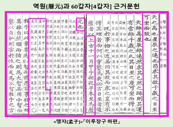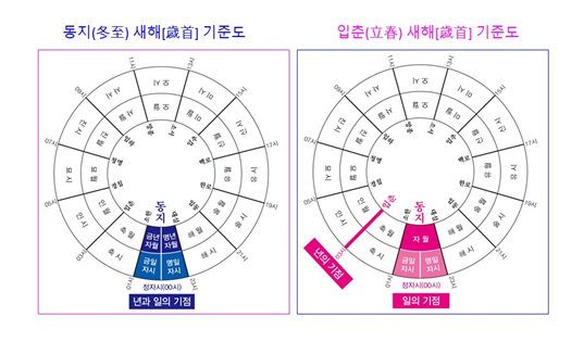 ※ 한자 문화권에서는 동지(冬至)를 역원(曆元)으로 삼고 이날을 갑자(甲子)년, 갑자(甲子)월, 갑자(甲子)일 갑자(甲子)시로 삼았다. 동지(冬至)로 새해를 정하면 갑자(甲子)년, 갑자(甲子)월, 갑자(甲子)일 갑자(甲子)시는 240년마다 다시 돌아오고, 입춘(立春)으로 새해를 정하면 4갑자 연월일시는 100만 년이 지나도 다시 돌아오지 않는다.