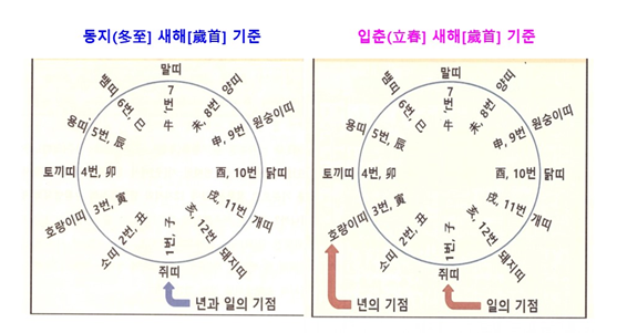 2025년 양력 2월 3일에 드는 입춘(立春)을 기준으로 을사(乙巳)년 뱀띠해[歲首]를 정하면, 새해[歲首]는 12지지의 세 번째인 인(寅)에서 시작되고, 새해 첫날의 시작[日首]은 12지지의 첫 번째인 자(子)에서 제각각 시작된다. 그러나 2024년 양력 12월 21일에 드는 동지(冬至)를 기준으로 을사(乙巳)년 뱀띠해[歲首]를 정하면, 새해[歲首]와 새해 첫날의 시작[日首]은 모두 12지지의 첫 번째인 자(子)에서 동시에 시작된다.