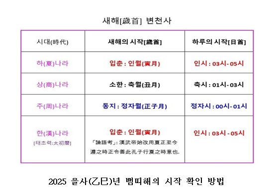 ※ 입춘(立春)으로 새해[歲首]를 정했던 고대 중국 하(夏)나라는 인시(寅時)로 날짜의 시작[日首]을 정했다. 고금의 명리학계와 같이 입춘(立春)으로 새해[歲首]를 정하고 자시(子時)로 날짜의 시작[日首]을 정한 시대는 물론 역법도 없었다.
