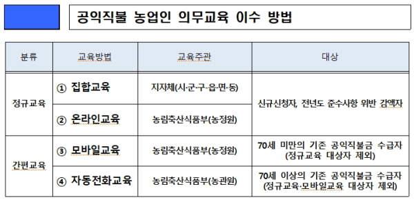 교육과정은 농업인 연령대 등을 감안하여 맞춤형으로 4개 과정[온라인, 모바일(URL), 자동전화(ACS-Automatic Calling System), 집합교육]을 운영하고 있으며, 농업인은 4개 교육과정 중 1개 과정을 2025년 9월까지 이수하면 된다. 우선 농업인의 의무교육 확대를 위해 온라인 교육을 2024년 12월부터 개설하여 운영하고 있으며, 모바일(URL)과 자동전화(ACS) 교육은 농업인의 2025년 직불금 신청이 끝난 5월 이후에 수강이 가능하며, 집합교육은 직불금을 신청한 지자체에서 2025년 초부터 수강할 수 있다.