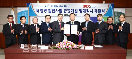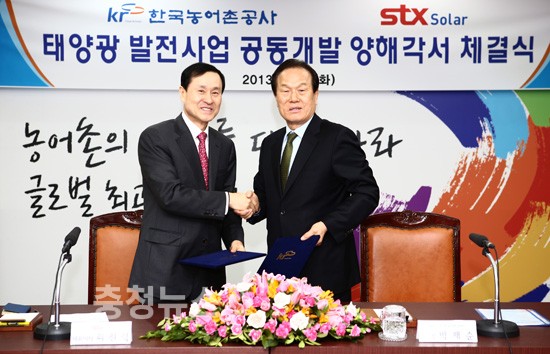▲ 한국농어촌공사(사장 박재순)와 STX솔라(대표 최진석)가 26일 태양광발전사업 MOU를 체결했다.