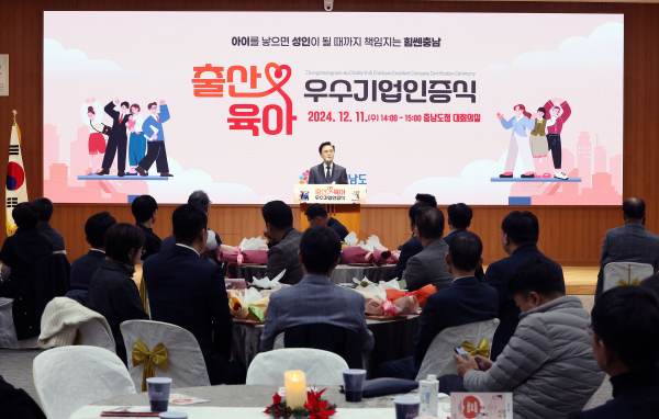 [충청뉴스 권상재 기자] 충남도는 11일 도청 대회의실에서 김태흠 지사와 기업 관계자 등 50여 명이 참석한 가운데, ‘출산·육아 우수기업 인증식’을 열고 일·가정 양립에 앞장선 도내 43개 기업에 우수기업 인증패를 수여했다.