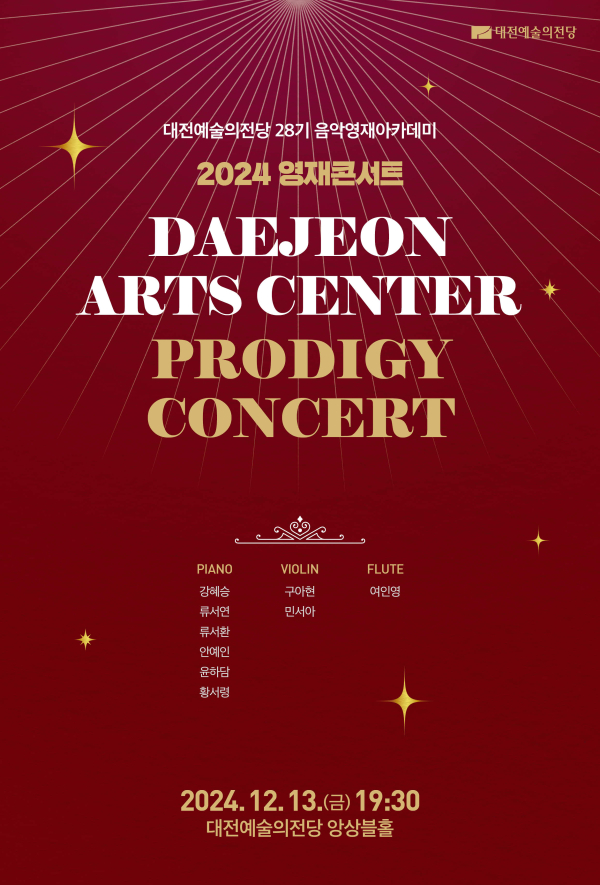[충청뉴스 박영환 기자] 대전예술의전당(관장 김덕규)은 오는 13일, 28기 음악영재아카데미 수강생 중 성적 우수자 9명의 영재콘서트를 개최한다고 밝혔다.