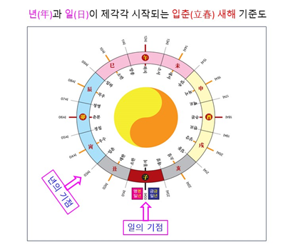 매년의 새해[歲首]는 입춘(立春)으로 정하고, 매일[日]의 시작[日首]은 00 시점으로 정하면, 위 표에서 확인했듯이 년과 일이 약 45도 떨어진 곳에서 제각각 시작된다. 이는 입춘부터 을사년 뱀띠가 시작된다고 하는 주장은 오류임을 입증하는 명확한 근거가 된다.