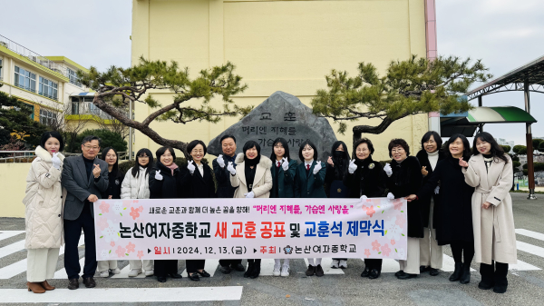[충청뉴스 논산 = 조홍기 기자] 논산여자중학교(교장 최은주)는 13일 동창회, 학부모, 학생, 교직원이 참석한 가운데 새로운 가치를 담은 교훈 ‘머리엔 지혜를 가슴엔 사랑을’을 선포하고 교훈석 제막식을 개최하였다. 이번 제막식은 제63회 개교기념일에 맞춰 개정한 새로운 교훈의 의미를 새기고 알리기 위해 마련된 자리였다.