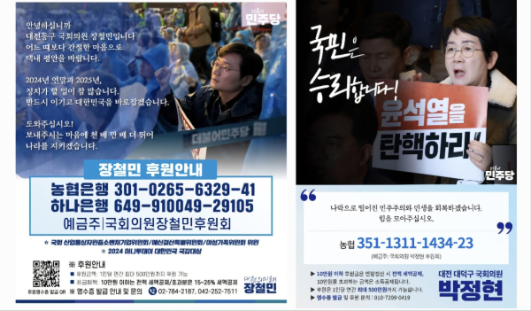 박정현 의원(초선·대덕구)도 페이스북에 “후원금을 아직 반도 채우지 못했다”며 “국민과 함께 내란극복과 국정안정을 위해 뛰겠다. 힘을 모아 달라”고 지원사격을 요청했다.