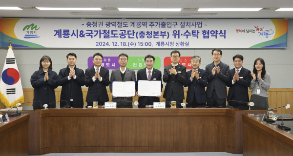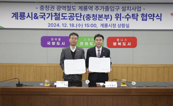 [충청뉴스 계룡 = 조홍기 기자] 계룡시(시장 이응우)는 18일 시청 상황실에서 충청권 광역철도 사업과 연계한 계룡역 추가출입구 설치사업의 효율적 추진을 위해 국가철도공단 충청본부(본부장 김종호)와 위·수탁 협약을 체결했다고 밝혔다.