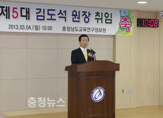 충남교육연구정보원은 4일 3층 대회의실에서 직원 60여명이 참여한 가운데 새로 부임하는 김도석 원장의 취임식을 열었다.