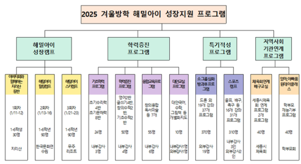 이번 2024년도 겨울방학 ‘해밀아이 성장캠프’는 ▲아버지회와 함께하는 지리산 겨울 산행(30명) ▲두드림 힐링캠프(30명) ▲해밀아이 힐링캠프(60명) ▲스포츠클럽 동계캠프(30명) ▲해밀아이 스키캠프(60명)로 구성되어 총 210명이 참가한다.