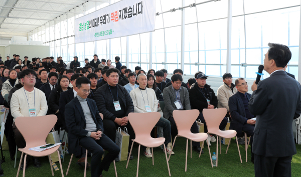 김태흠 지사와 올해 창업한 청년 CEO 38명, 예비 창업 청년농 등 150여 명이 참석한 가운데 연 이날 합동 창업식은 단비내린딸기 운영 계획 발표, 창업증서 수여, 시설 견학 등의 순으로 진행했다.