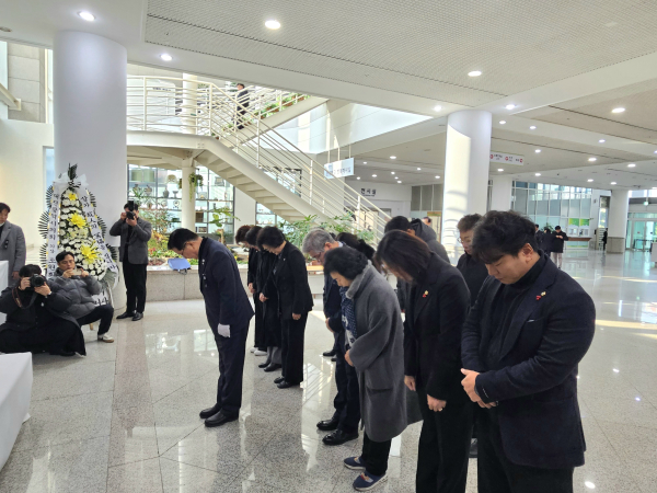 [충청뉴스 김용우 기자] 30일 대전시청 1층에 마련된 '제주항공 여객기 사고 희생자 합동분향소'에 이장우 대전시장과 박범계(서구을) 더불어민주당 의원 등 지역 정치인들의 조문 행렬이 이어지고 있다.