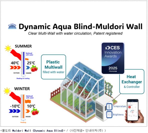 물의 열차단, 투과율 향상, 높은 비열 특성을 활용한다. 공기층이 있는 복층 플라스틱에 물을 채우거나 비울 수 있고, 저전력으로 온실 온도를 조절하며, 다양한 크기의 온실에 대응할 수 있도록 모듈형으로 제작된다.