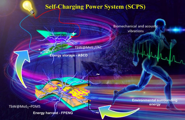 연구팀은 희토류 금속인 터븀 텅스텐을 2D 물질인 황화몰리브덴에 삽입한 복합재를 이용해 자가 충전 전력 시스템의 두 축인 압전 발전 소자와 슈퍼커패시터 음극재 역할을 모두 수행하도록 했다.