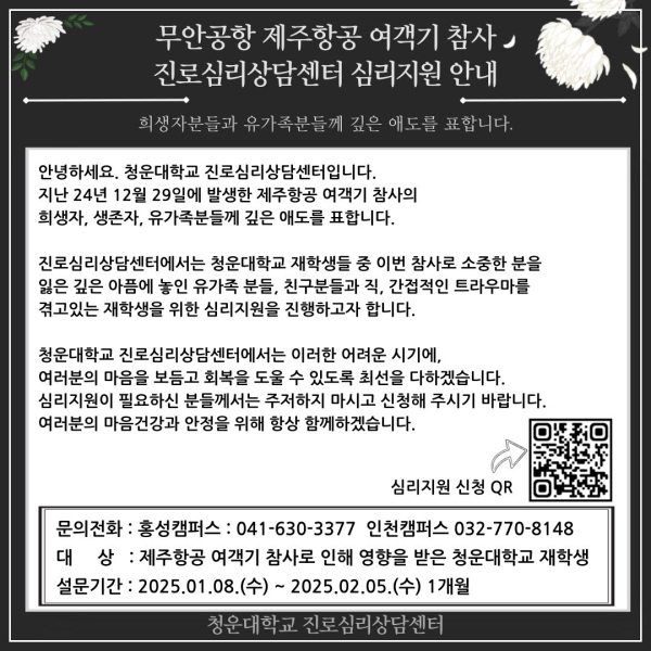 청운대학교 무안공항 제주항공 여객기 참사 진로심리상담센터 심리지원 포스터