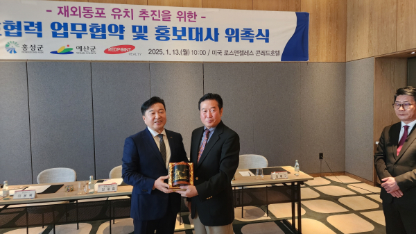 협약식에 최재구 군수는 “이번 미국 LA 재외동포 역이민 유치를 위해 많은 지원과 도움을 주신 김태흠 도지사님과 캐빈백 미국 레드포인트 그룹 대표이사님께 진심으로 감사를 드린다”며 “저를 비롯한 예산군민 모두는 이번 협약식을 진심으로 환영하며, 우리 예산군으로의 역이민자 유치를 위해 우리군에서는 모든 행정역량을 적극 지원해 나갈 것”이라고 밝혔다.