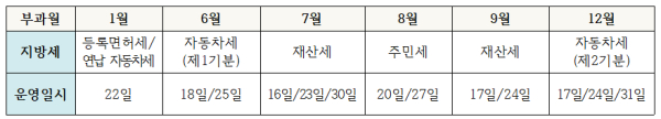 지방세 정기분 납부 기간 중 매주 수요일 18시 ~ 21시(3시간) 운영