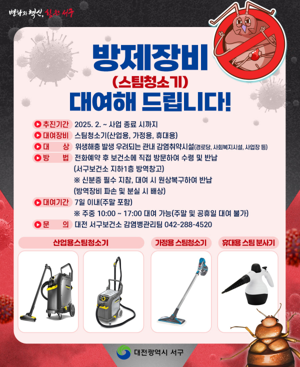 [충청뉴스 박영환 기자] 대전 서구는 감염취약시설 위생해충 방역을 위해 ‘스팀청소기 무료 대여사업’을 시행한다고 16일 밝혔다.
