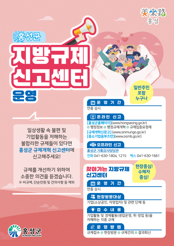 또한 군은 올해부터 군민들이 일상 속 또는 경제활동 중 불편했던 규제사항을 보다 쉽게 건의할 수 있도록 읍․면 행정복지센터, 사업소 등 내에도 ‘홍성군 지방규제신고센터’ 창구를 상시 운영할 계획임을 밝혔다.
