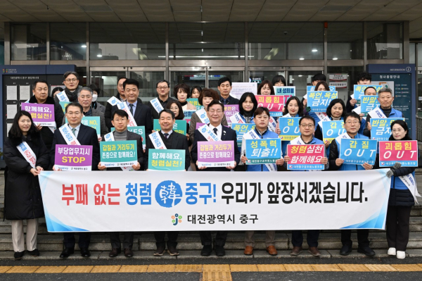 [충청뉴스 박영환 기자] 대전 중구는 설 명절을 앞둔 20일 아침 출근길 구청사 현관 및 부서를 방문해 음주운전 근절 및 청렴 문화 확산을 위한 청렴 캠페인을 전개했다고 밝혔다.