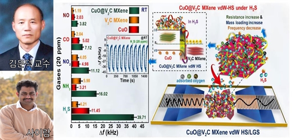 이번 연구에서 김 교수팀은 표면탄성파(SAW) 소자에 정전기적 자가 조립 지원 제작된 반응물질인 ‘CuO@V2C MXene’을 하이브리드 반데르발스 이종 구조(vdW-HS) 감지 소자로 제작했다.