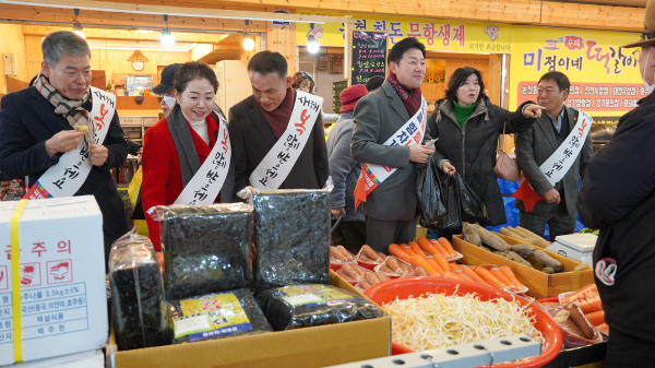 이준배 시당위원장과 주요당직자들은 설명절을 앞두고 장바구니 물가를 점검하기 위해 직접 장을 보며 시장을 찾은 시민들과 상인들에게 설인사를 전했다.