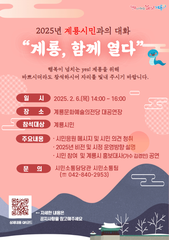 [충청뉴스 계룡 = 조홍기 기자] 계룡시(시장 이응우)는 오는 6일(목) 오후 2시 계룡문화예술의전당 대공연장에서 '계룡, 함께 열다'라는 주제로 2025년 시민과의 대화를 개최한다고 밝혔다.