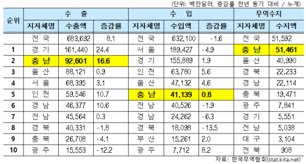 충남은 2023년 무역수지 흑자액이 385억 7200만 달러로, 울산(423억 1500만 달러)에 뒤지며 1위 자리를 잠시 내줬다.