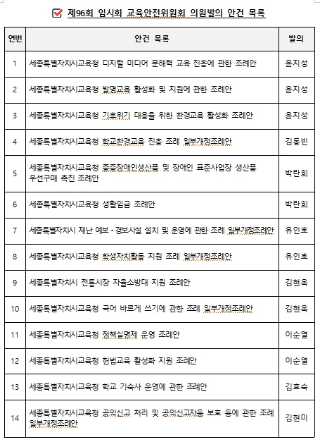 아울러, “조례안 16건, 동의안 1건을 심사할 예정으로, 이중 교육청 소관은 15건, 시민안전실 소관은 1건, 소방본부 소관은 1건”이라고 덧붙였다.