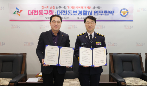[충청뉴스 박영환 기자] 대전 동구는 10일 구청장 접견실에서 동부경찰서(서장 강동하)와 ‘위기관계 피해자 지원’을 위한 업무협약을 체결하고, 대전시 최초로 피해자들에게 ‘일상회복지원금’을 지급한다고 밝혔다.