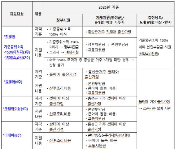 지원대상은 홍성군에 주소를 둔 기준중위소득 150% 이하인 출산가정이며, 출생일 기준 산모가 6개월 이상 홍성군에 주민등록을 둔 경우 ▲본인부담금 최대 90% 지원 ▲쌍태아 이상 출산가정 기간 연장(최대 8주) ▲중위소득 150% 초과자 서비스 최대 2주 지원 ▲신생아 외에 만 18세 이하의 형제·자매가 있는 경우 양육의 부담을 해소하기 위해 큰아이 돌봄 지원 서비스를 받을 수 있다.
