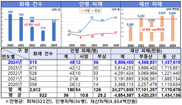 연도별 화재 건수 및 사상자(사망자), 재산 피해액은 △2020년 2075건 63명(사망 17, 부상 46), 223억 5682만 원 △2021년 2015건 72명(사망 17, 부상 55), 384억 8751만 원 △2022년 2157건 86명(사망 16, 부상 70), 408억 6811만 원 △2023년 1980건 105명(사망 14, 부상 91), 459억 7161만 원 △지난해 1911건 94명(사망 19, 부상 75), 360억 2669만 원 등이다.