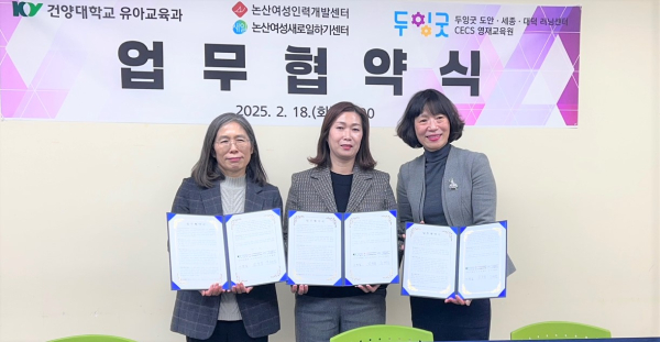 [충청뉴스 논산 = 조홍기 기자] 논산 여성인력개발센터(관장 임정란)는 18일 건양대 유아교육과·두잉굿 도안·세종·대덕 러닝센터 및 CES영재교육원과 ‘2025년 도내 여성 일자리 창출을 위한 대학연계 직업교육 훈련과정 운영 계획’ 추진을 위한 업무협약(MOU)을 체결했다고 밝혔다.