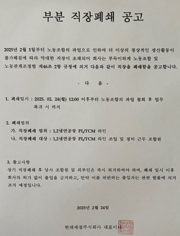 [충청뉴스 최형순 기자] 현대제철이 노조의 과도한 성과급 요구와 반복되는 파업에 맞서 창사 이래 '부분 직장 폐쇄'라는 초강수를 뒀다.