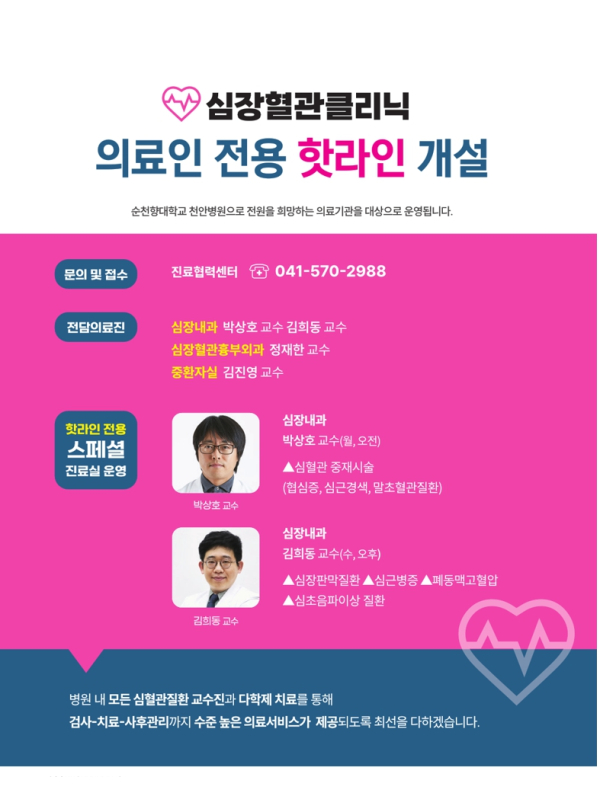 [충청뉴스 박동혁 기자] 순천향대학교 부속 천안병원은 오는 3월부터 심혈관질환 환자의 빠른 치료를 위한 의료인 전용 ‘핫라인’을 개설한다고 25일 밝혔다.