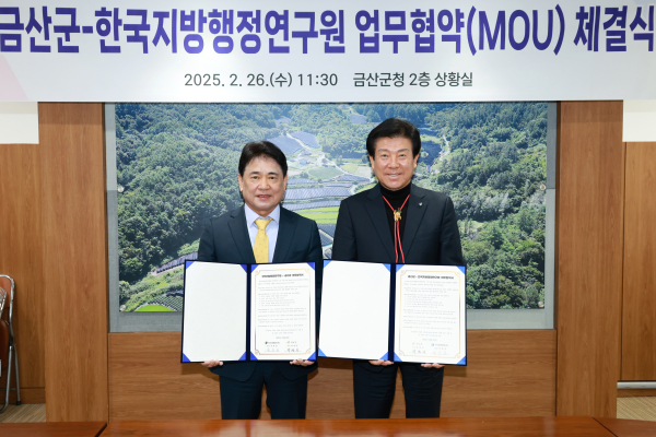 박범인 금산군수는 “이번 협약이 양 기관의 지속 가능한 성장과 발전을 위한 시발점이 되기를 바란다”며 “한국지방행정연구원의 전문성을 바탕으로 금산군이 한 단계 더 도약할 수 있을 것”이라고 말했다.
