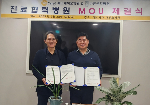 [충청뉴스 최형순 기자] 대전 지역 어르신들의 건강한 노후를 지원하기 위해 예스케어 요양원·주간보호센터(대표 조민)와 바른생각병원(병원장 전택수)이 손을 맞잡았다.