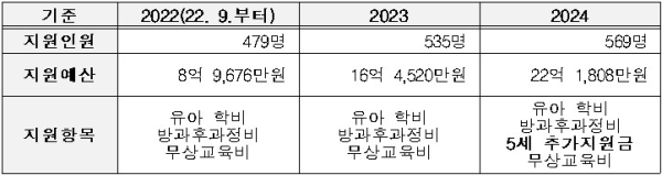 충남교육청은 만 3~5세 외국 국적 유아를 대상으로 초등학교 취학 직전 최대 3년간 유아 학비를 2022년 9월부터 자체 지원하고 있다. 충남의 외국 국적 유아 수는 2022년 9월 대비 지속적으로 증가하고 있다.