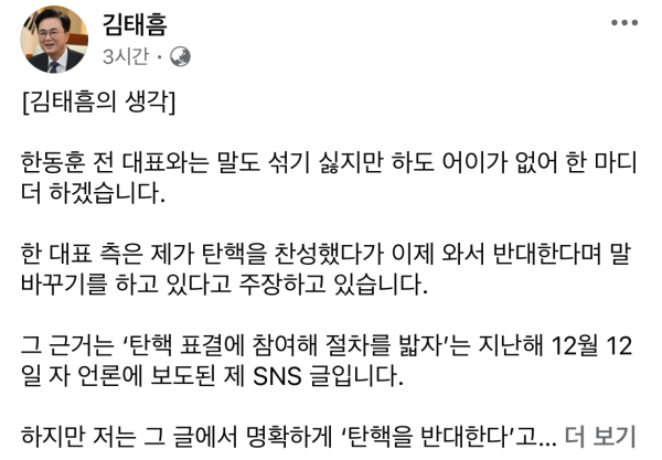이어 “하지만 저는 그 글에서 명확하게 ‘탄핵을 반대한다’고 썼다”며 “‘어떤 결정을 하든지, 단합된 결정은 분열보다 낫다’고도 강조했다”고 지적했다.