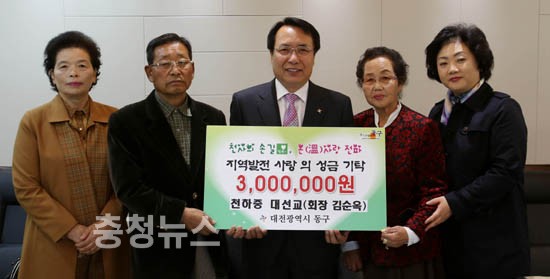 대전 동구 판암동 소재 종교단체 천하중 대선교(회장 김순옥)는 9일 한현택 동구청장을 찾아 복지소외계층을 위한 천사의 손길 후원금 3백만원을 전달했다.