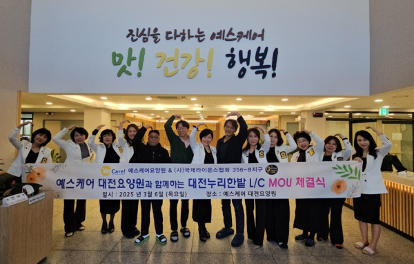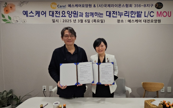 [충청뉴스 최형순 기자] 대전 지역 어르신들의 건강한 노후를 지원하기 위해 예스케어 요양원·주간보호센터(대표 조민)와 (사)국제라이온스협회 356-B지구 대전누리한밭 L/C(회장 변규리)가 손을 맞잡았다.